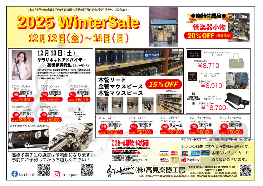 今回もクラリネットの高橋多美先生をアドバイザーにお迎えして楽器の選定やマウスピースの選定などご相談に乗っていただけます!